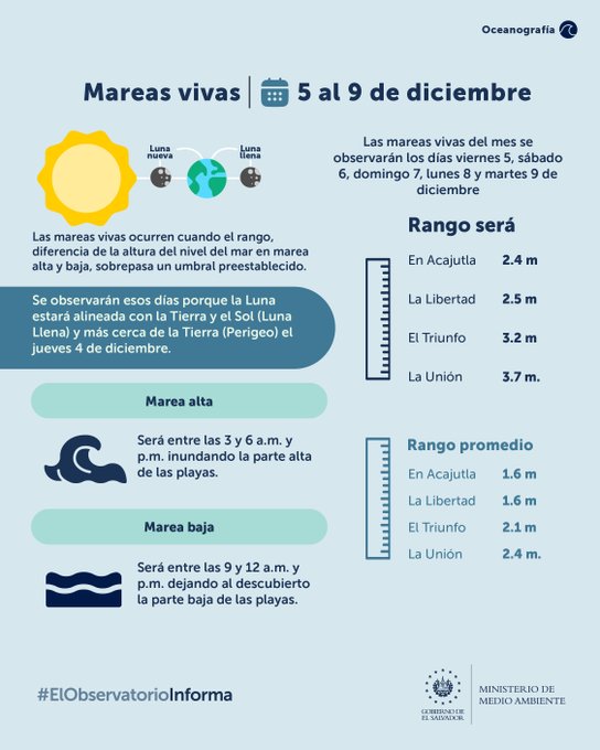 Las mareas vivas iniciarán en las costas salvadoreñas a partir de este viernes 5 de diciembre, por lo que, el nivel del mar aumentará considerablemente durante los próximos días según indicó este jueves el Ministerio de Medio Ambiente y Recursos Naturales (Marn).