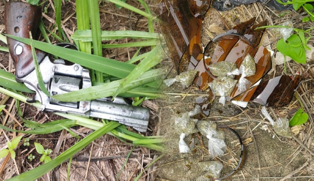 Personal de la Fuerza Armada reportó que durante patrullajes que realizaron, este martes, en zonas de Ciudad Real, en Santa Ana, encontraron en calidad de abandono un arma de fuego y varias porciones de marihuana dentro de una botella de vidrio.