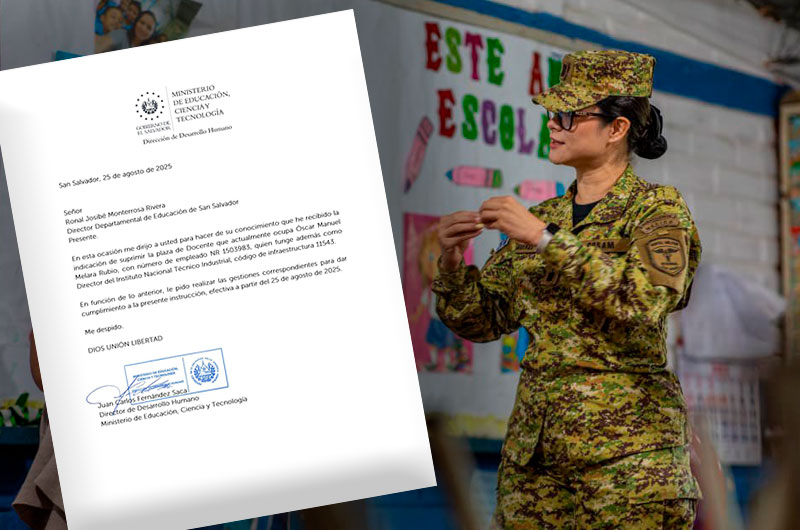 Las cartas difundidas por la titular del Mined fueron firmadas por Juan Carlos Fernández Saca, director de Desarrollo Humano, quien detalló haber "recibido la indicación de suprimir la plaza de docente" que ocupan Óscar Manuel Melara Rubio (director del INTI) y Eliezar Otoniel Delgado (subdirector).