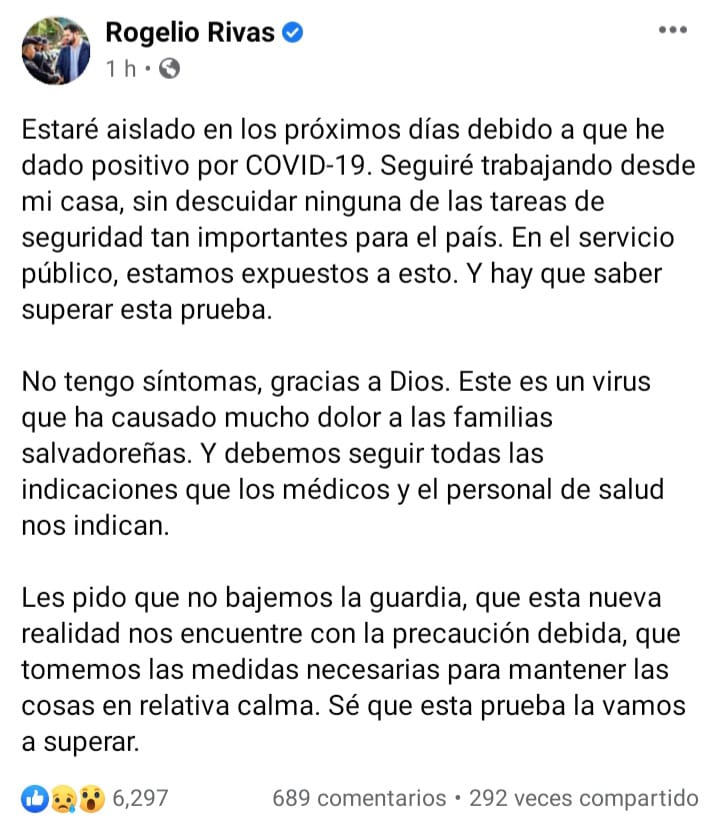 "No tengo síntomas, gracias a Dios. Este es un virus que ha causado mucho dolor a las familias salvadoreñas. Y debemos seguir todas las indicaciones que los médicos y el personal de salud nos indican" aseguró el ministro.