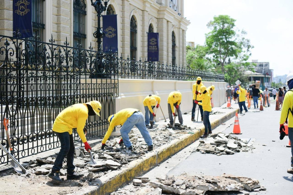 El Ministerio de Obras Públicas informó que las intervenciones que realizan en el Centro Histórico de San Salvador incluyen la modificación del acceso principal del Palacio Nacional, frente a la plaza Gerardo Barrios.