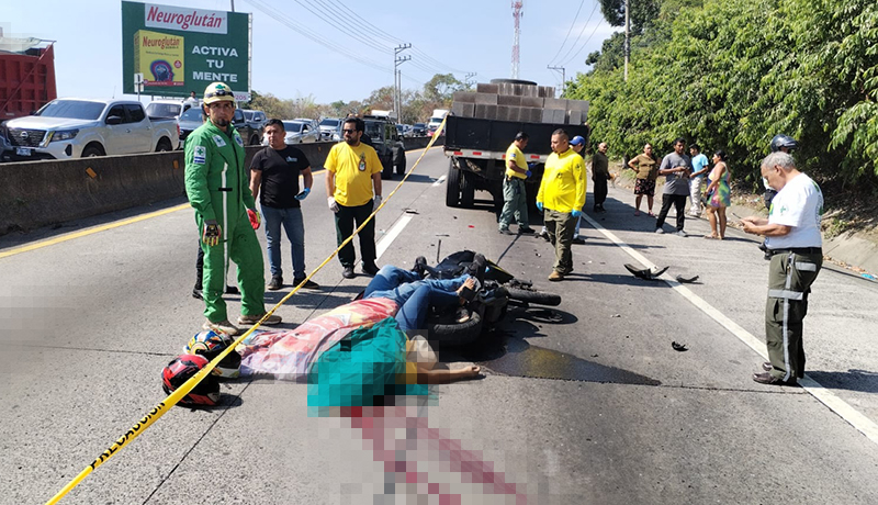 Según testigos, el motociclista intentó circular en el carril auxiliar sin percatarse que el camión estaba estacionado y fallecieron en el instante del impacto.