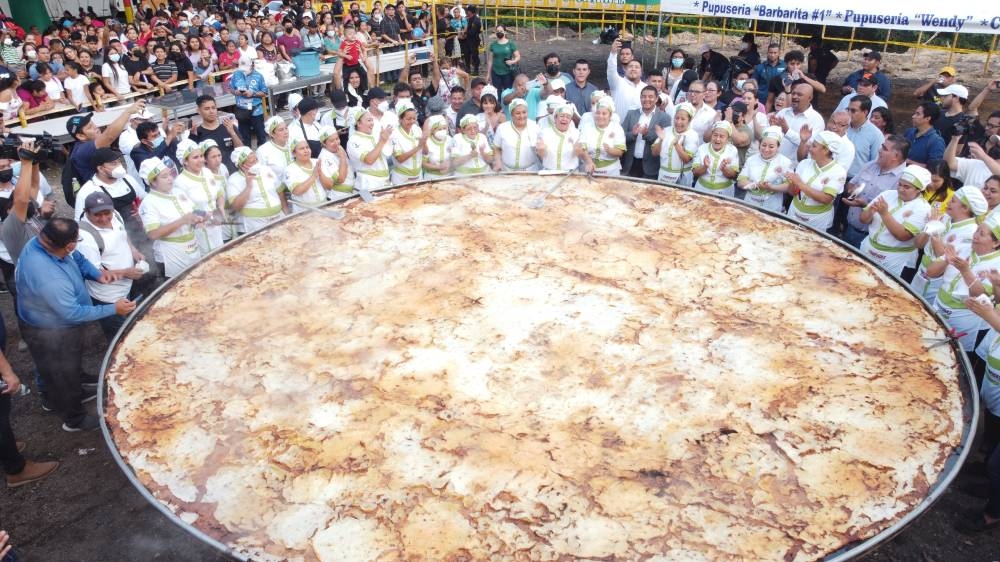 Con más de cinco metros y medio de diámetro y cientos de libra de masa e ingredientes, Olocuilta, en La Paz, consiguió este domingo volver a coronarse como la localidad que elabora cada año la pupusa más grande del mundo.