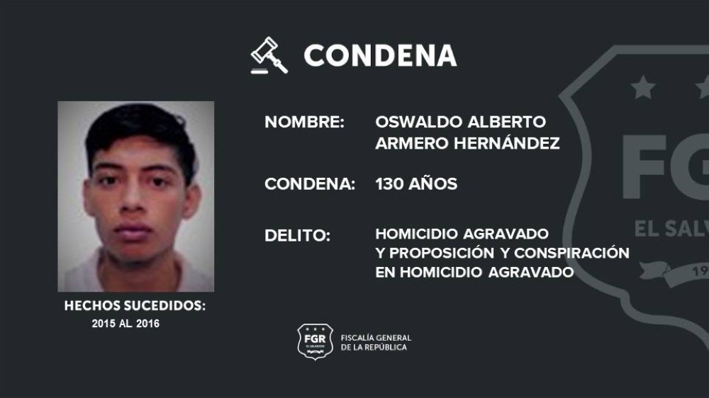 La FGR informó que el pandillero de la 18 fue sentenciado en el Tribunal Quinto Contra el Crimen Organizado de San salvador, donde fue declarado culpable de “cuatro homicidios agravados consumados, por lo que se le impuso la pena de 30 años por cada caso, sumando un total de 120 años y agregaron 10 años, por el ilícito de proposición y conspiración en el delito de homicidio”.