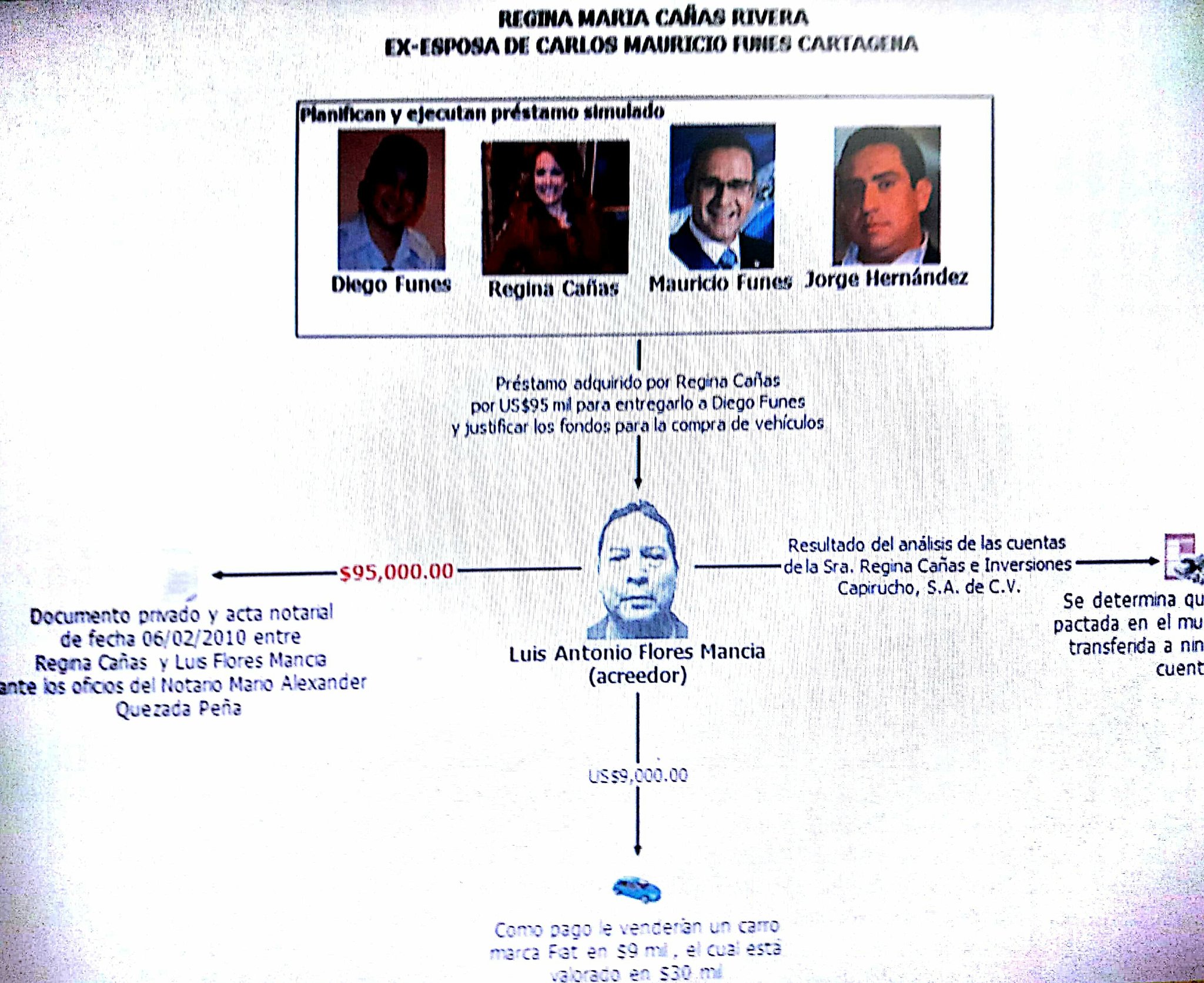 También se mencionó a Regina Cañas, quien fue esposa de Funes. A ella se le acusa de haber hecho un teatro con un préstamo por $95,000. De acuerdo con la Fiscalía, Cañas, junto con su hijo, el mismo exmandatario y el comunicador Jorge Hernández, planearon un préstamo, que al final no lo fue, solamente para presentar esa prueba ante probidad.