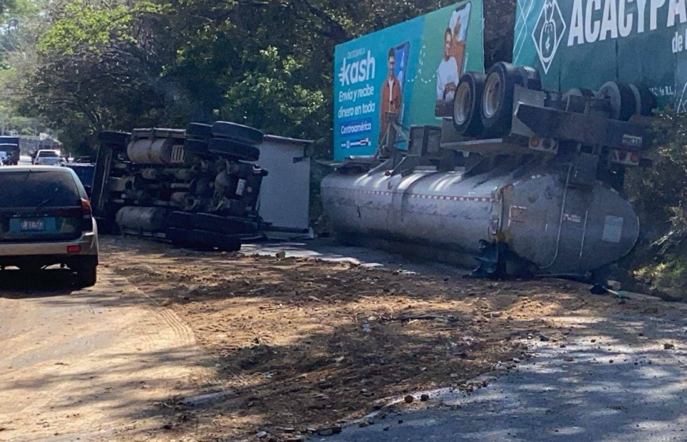 Reportamos un accidente de tránsito, donde el conductor de un cabezal que transportaba aceite, perdió el control y volcó sobre el km 86 de la carretera Troncal del Norte, en La Palma, Chalatenango.