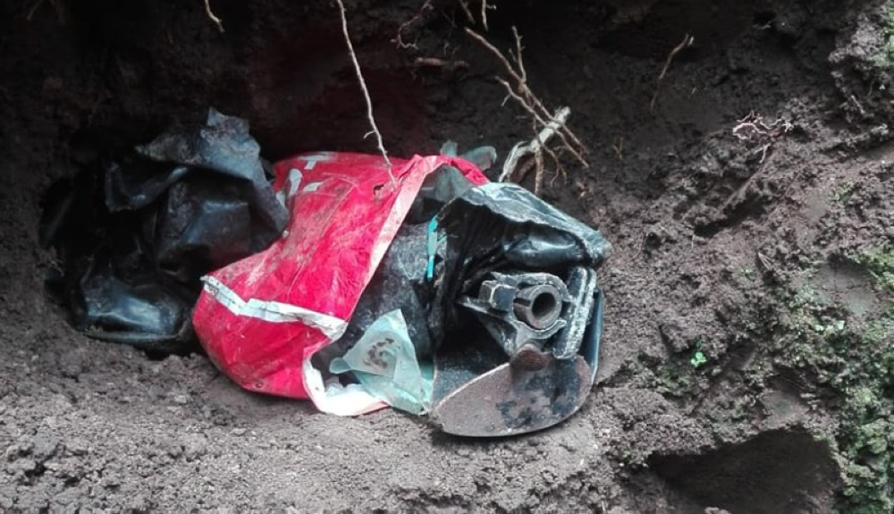 En la fotografía que publicó la PNC en su cuenta de Twitter se muestra cómo el arma estaba en bolsas de plástico y abandonada en una especie de cueva.