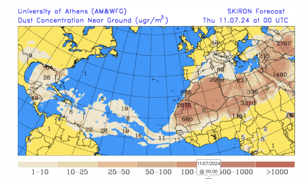 El pronóstico de la Universidad de Atenas señala que el polvo del Sahara ya se está acercando sobre el océano Atlántico, y este domingo llegarán a las Antillas Menores, el lunes cubrirá las Antillas Mayores y el miércoles estarán sobre Honduras, la Península de Yucatán y la Florida.
