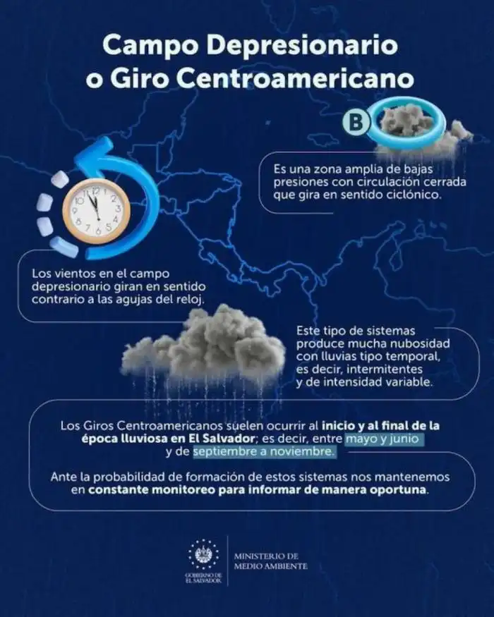 “Lo que está sucediendo ahorita es el giro centroamericano, que es una zona extensa de baja presión con un giro contrario a las manecillas del reloj”, explicó ayer en conferencia de prensa el ministro de Medio Ambiente, Fernando López.