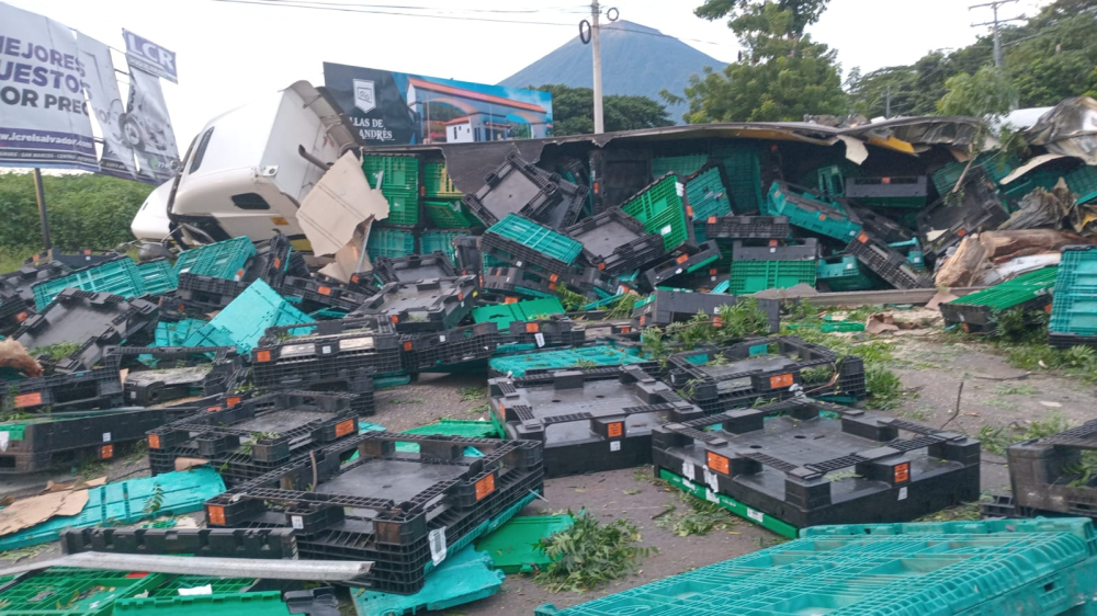 La rastra chocó y se salió de la carretera, informó la Policía Nacional Civil (PNC), que únicamente informa de los accidentes que ocurren en el país a través de su cuenta X. "Del impacto, el contenedor se zafó y dejó su cargamento esparcido por la carretera", posteó dicha cuenta.