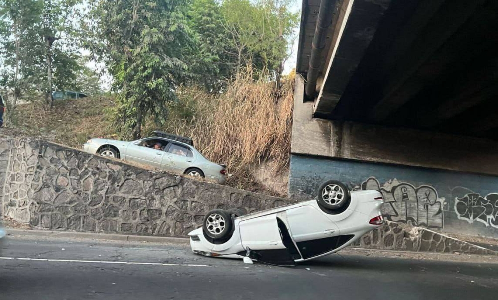 Usuarios en redes sociales reportaron este jueves por la mañana que un vehículo volcó en la carretera de Oro, con dirección hacia San Martín, debajo de un puente que conecta la colonia San José en el municipio de Soyapango, San Salvador.