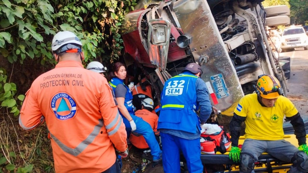 Autoridades del equipo táctico operativo de Protección Civil y del Sistema de Emergencias Médicas (SEM) rescataron a dos personas que quedaron atrapadas en la cabina de un camión que sufrió un accidente de tránsito la mañana de este viernes en San Juan Opico, La Libertad.
