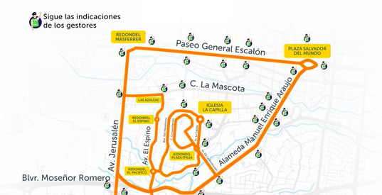 La circulación vehicular estará restringida durante cinco horas de mañana domingo 22 de marzo sobre la Avenida Jerusalén, un tramo del Paseo General Escalón desde la Plaza Divino Salvador del Mundo y la Alameda Manuel Enrique Araujo, en la capital, San Salvador Centro.