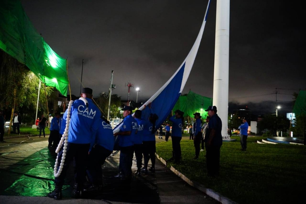 El pabellón fue colocado durante la madrugada del 22 de mayo, días previos a la toma de posesión de Nayib Bukele, y la comuna anunció que iniciarían una etapa de pruebas para evaluar los efectos del clima en la bandera de tela microperforada.