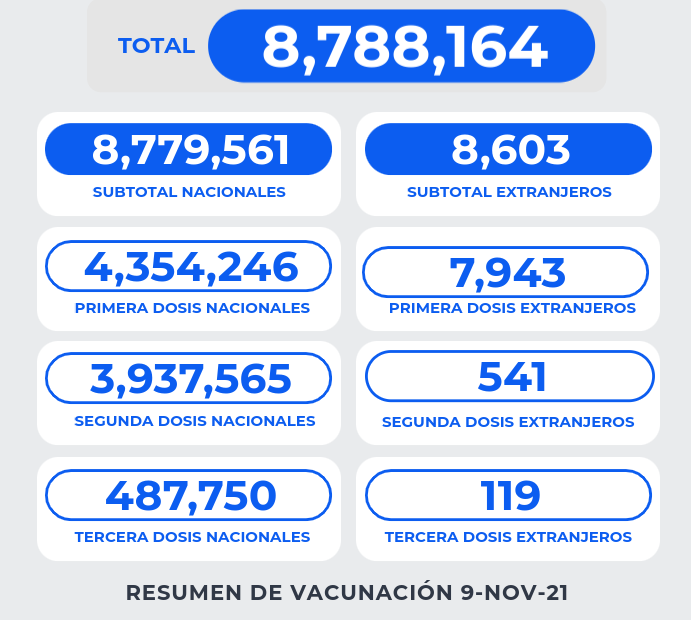 En total, El Salvador ha aplicado un total de 8,788,164 dosis de vacunas contra el covid-19. De estas, al menos 3.9 millones de personas ya recibieron al menos dos dosis de este fármaco, y unos 4.3 millones han recibido al menos una vacuna, agregó.