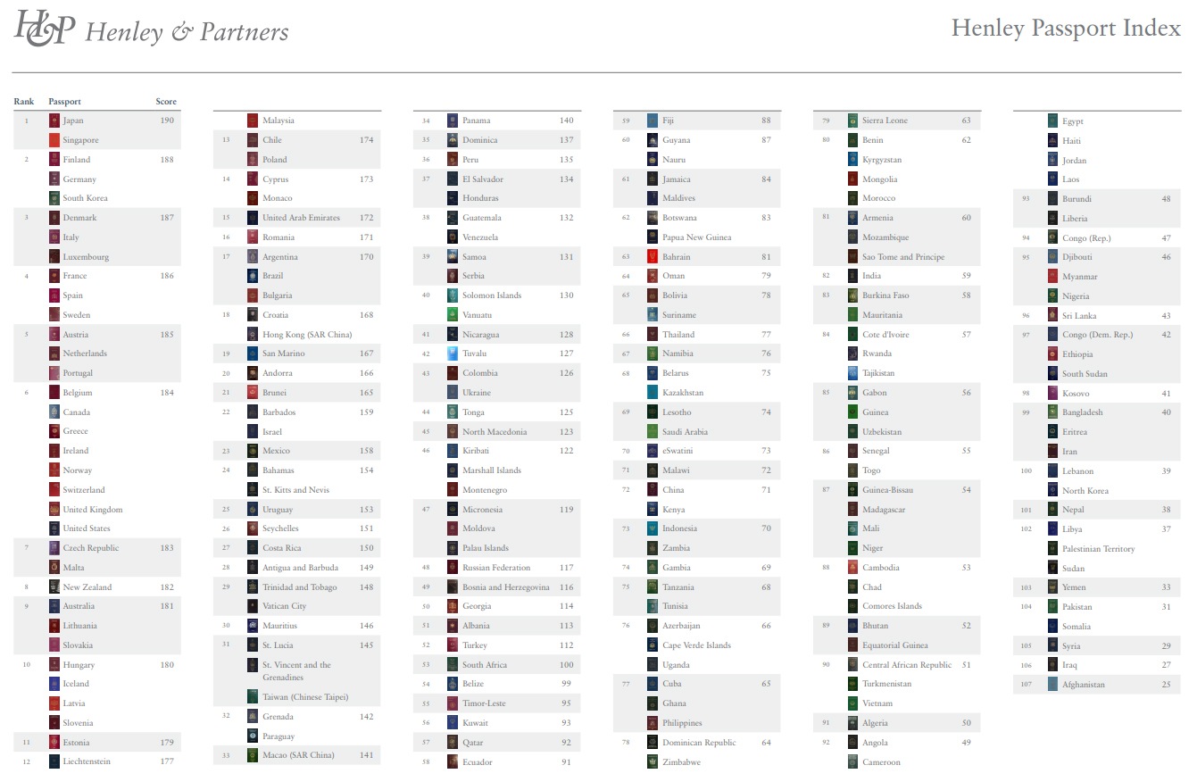 Los pasaportes que se ubican en la cima de la clasificación como los más poderosos del mundo siguen siendo Japón y Singapur, que ofrecen acceso a 190 países cada uno. Finlandia, Corea del Sur y Alemania se posicionan en el segundo lugar; los ciudadanos de estos tres países pueden ingresar a 188 naciones sin una visa previa (Consulte acá el ránking global).