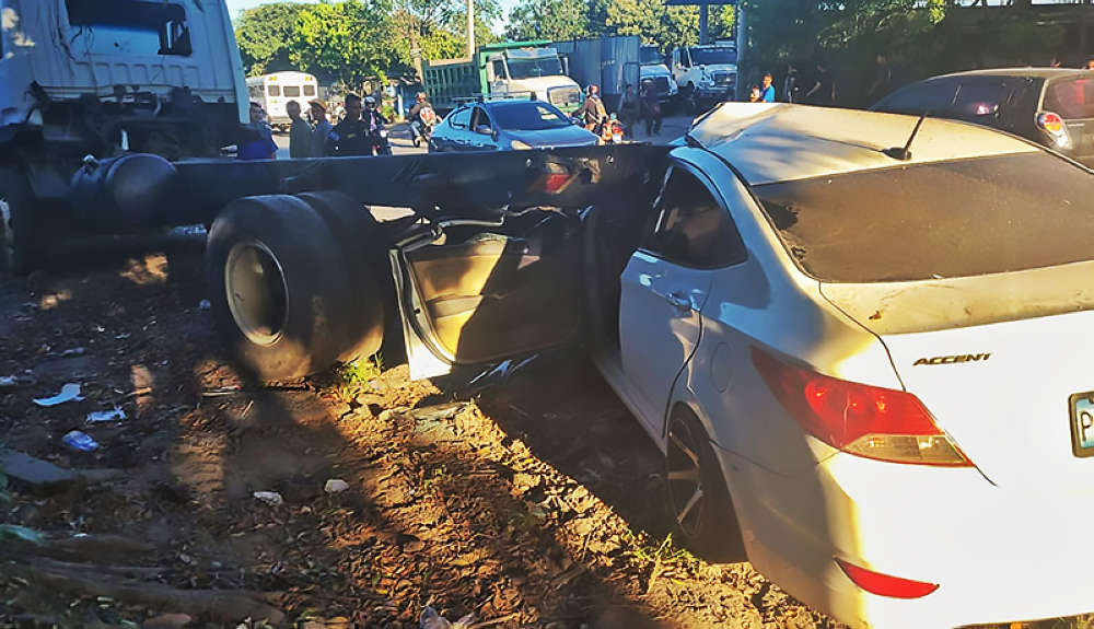 El conductor de un vehículo particular chocó el sedán que manejaba contra la parte trasera de un cabezal, y cuatro ocupantes del carro resultaron con lesiones de consideración, según un reporte preliminar de la Policía Nacional Civil (PNC).