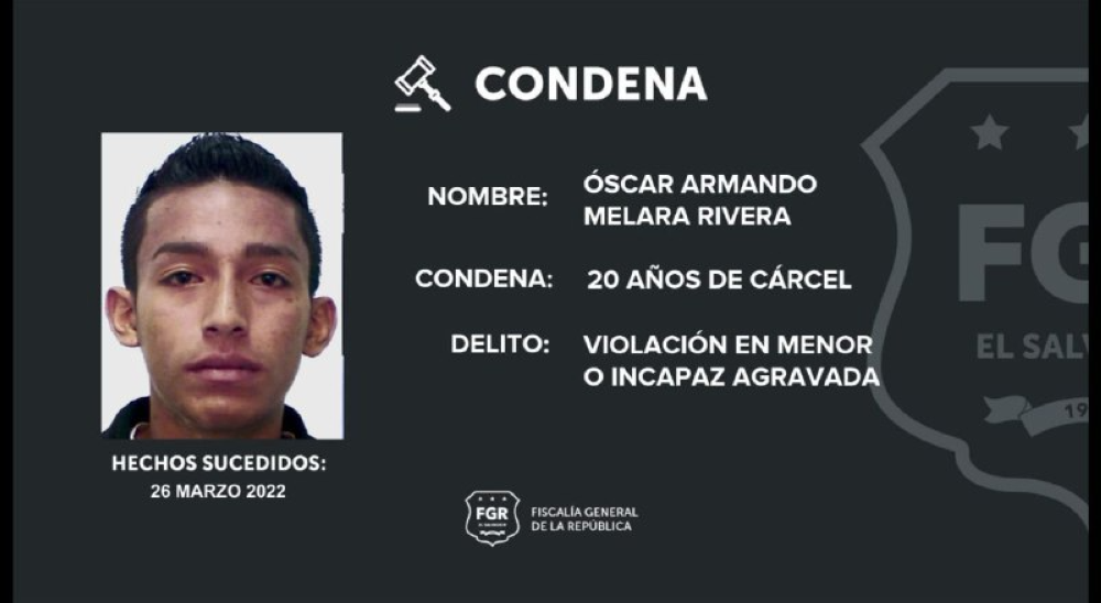 El Tribunal Segundo de Sentencia de San Salvador sentenció a Óscar Armando Melara Rivera q 20 años de carcel por el delito de violación en contra de una menor de edad.