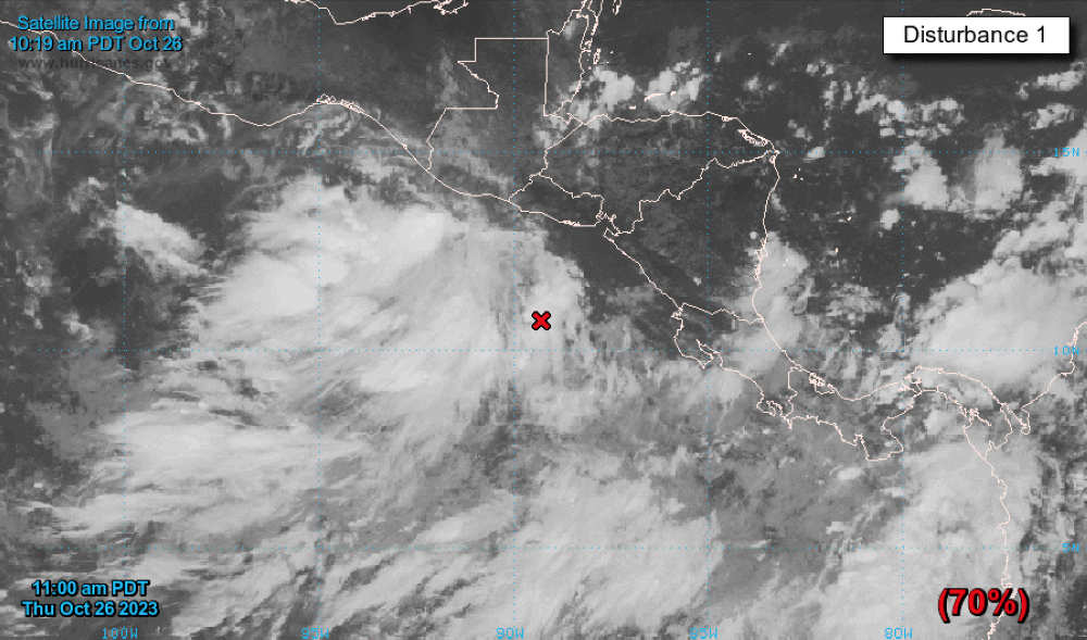 Según el mapa mostrado, las nubes se reorganizan frente las costas salvadoreñas y guatemaltecas, en el océano Pacífico, causando tormentas desorganizadas, pero sí configurada en una baja presión a cien millas de tierra centroamericana.