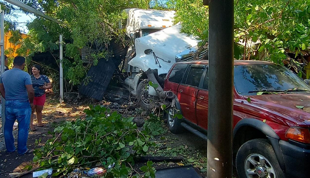 Un trailer se salió de la carretera Litoral, al sur de San Miguel, luego de chocar con un vehículo particular que lo llevó a perder el control de la rastra. Esta última terminó en el muro de una vivienda y colisionó en la parte trasera de una camioneta estacionada.