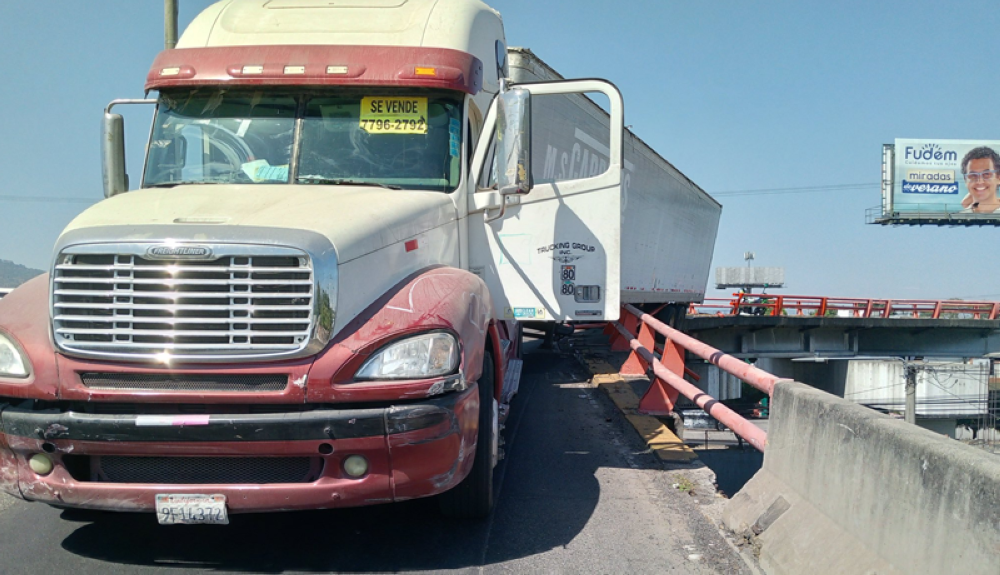 Paso cerrado en el paso a desnivel de la 49 avenida sur y bulevar Venezuela, el conductor de una rastra hizo una mala maniobra y chocó contra los barandales.