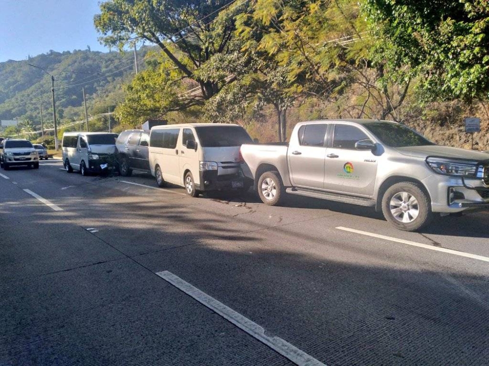 Al menos un lesionado dejó un múltiple accidente de tránsito en el kilómetro 10 de la Autopista a Comalapa, en el sentido hacia San Salvador.