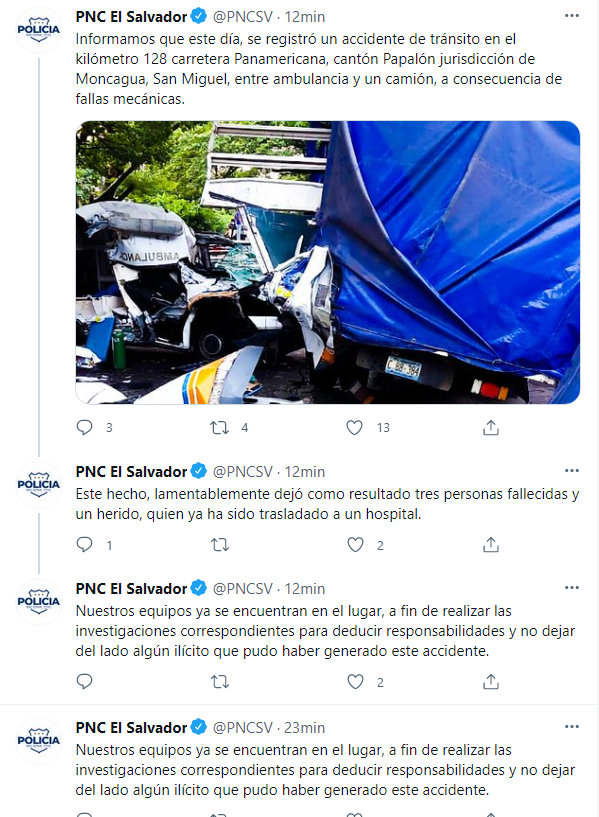 A las 9 de la mañana, la Policía Nacional Civil (PNC) escribió un tuit donde señalan que hubo una falla mecánica, sin brindar mayores detalles.