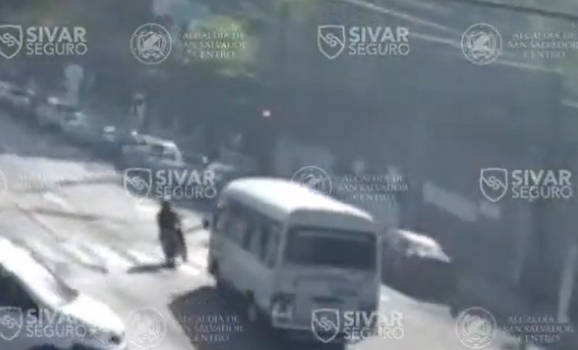 Las cámaras del sistema de videovigilancia de la alcaldía de San Salvador Centro, Sívar Seguro, captaron este miércoles un choque entre un microbús y un motociclista en el semáforo de la Alameda Roosevelt y 33 avenida Norte, en el distrito capital.