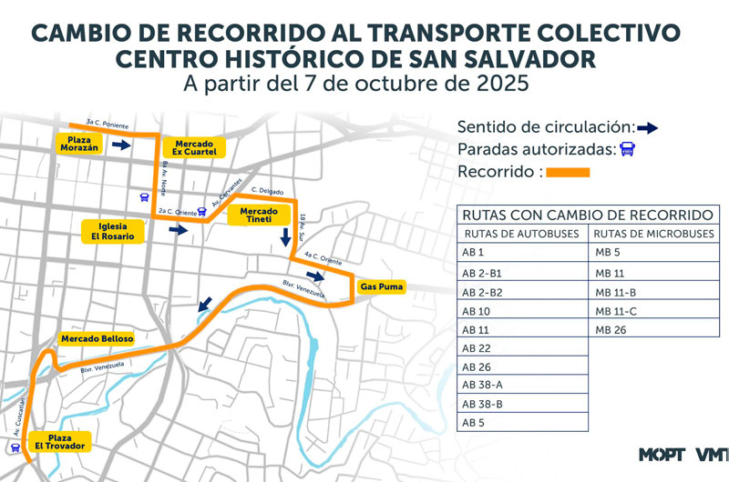 Los cambios corresponden al recorrido de las rutas de norte a sur, en el Centro Histórico de San Salvador, informó la institución.