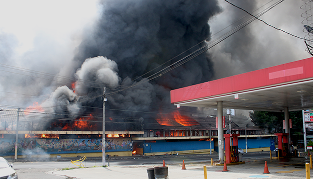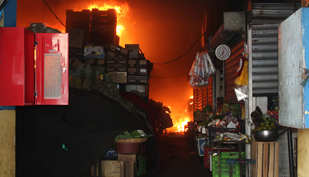 Un voraz incendio estructural fue reportado aproximadamente a las 10 de la mañana en el mercado San Miguelito, en San Salvador, el fuego consumió los puestos del área de bazares donde habían piñatas y flores.