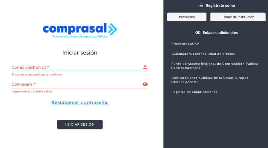 Según el artículo 10 de la Ley de Compras Públicas, todas las instituciones de la administración pública están obligados a utilizar el sistema electrónico Comprasal, en el cual deben registrar toda la información sobre las contrataciones del Estado; las contrataciones sujetas a la Ley de Compras Públicas fuera del sistema Comprasal son consideradas “infracciones graves”. Además, es responsabilidad “de todos los proveedores del Estado mantener la información actualizada” en el Registro Único de Proveedores del Estado del sistema de Comprasal.