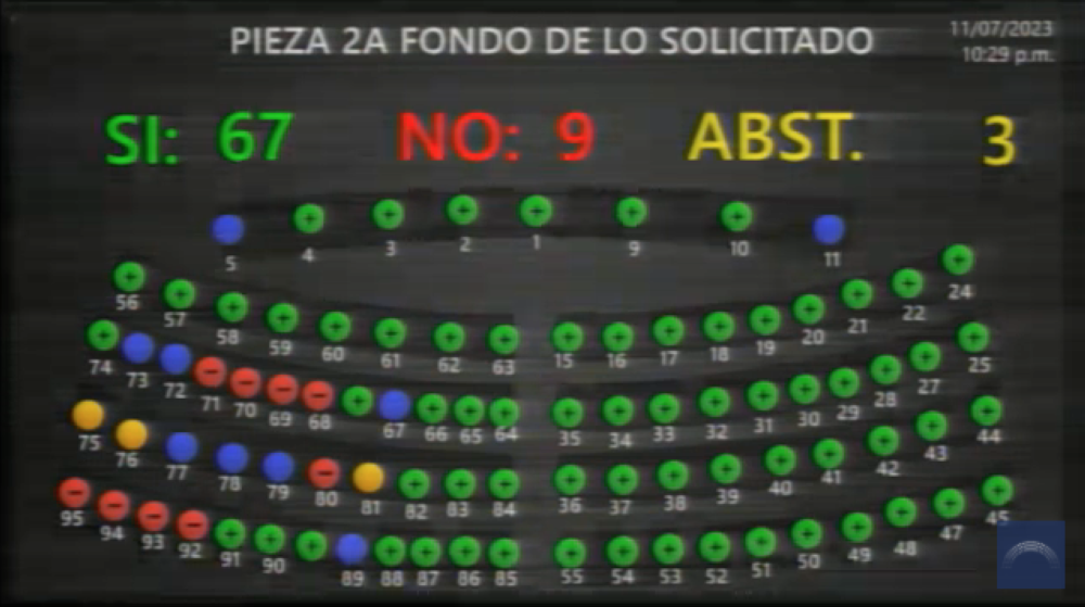El decreto de prórroga fue aprobado con 67 votos de Nuevas Ideas y sus aliados; 9 diputados votaron en contra –3 de Arena, 4 del FMLN, Vamos y Nuestro Tiempo– y 3 abstenciones de Arena. Cinco diputados estaban ausentes.
