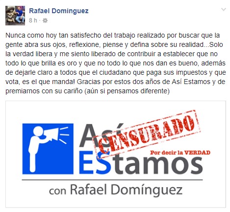 Tras conocerse que salió del aire el programa "Así Estamos" del canal 8 de Agape, conducido por Rafael Domínguez, el partido ARENA ha emitido un comunicado en el que "expresa su preocupación y rechazo ante acciones del Gobierno del FMLN, que en un acto más de demostración de matonería e imposición, presionó a AgapeTV a fin que sacaran del aire el programa "Así Estamos"", reza un comunicado enviado por el grupo parlamentario, este día.