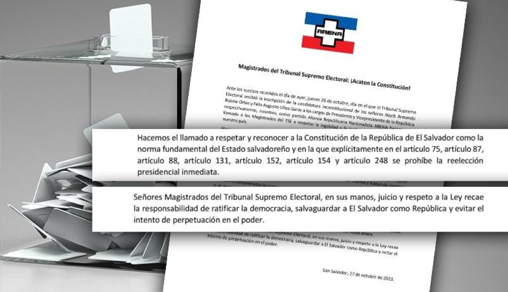 El partido Alianza Republicana Nacionalista (Arena) dirigió este viernes un pronunciamiento público a los magistrados del Tribunal Supremo Electoral (TSE) a quienes llamó a "respetar y reconocer" los seis artículos de la Constitución de la República en los que "se prohibe la reelección presidencial inmediata".