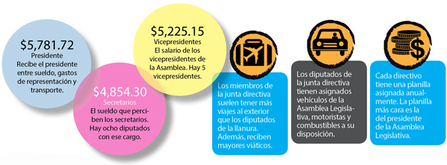 Algunos de los privilegios que tienen los diputados de la junta directiva son constantes viajes al exterior, mayores viáticos que los diputados de la llanura, oficinas, vehículos nacionales, gasolina, teléfonos, secretarias y motoristas asignados.