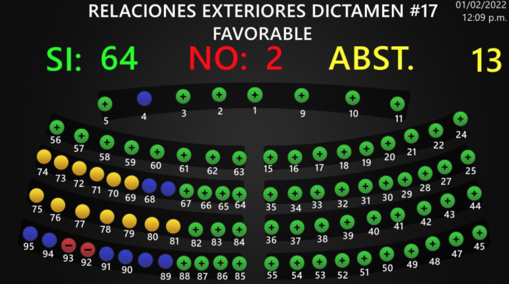 La ratificación del Convenio de Suscripción de Acciones de Capital Ordinario entre la CAF y la República de El Salvador e Incorporación de la República de El Salvador como País Miembro recibió 64 votos. Hubo 12 abstenciones de Alianza Republicana Nacionalista (Arena) y de Nuestro Tiempo: y dos votos en contra: Jaime Argueta y Marleni Funes, del Frente Farabundo Martí para la Liberación Nacional (FMLN). Las diputadas Anabel Belloso y Dina Argueta no votaron. Tampoco Vamos ni Nuestro Tiempo.Este convenio permitirá la compra de acciones por $460 millones por parte de El Salvador, que son 32,397 acciones nominativas de la Serie “B”, valoradas en $14,200 cada una.