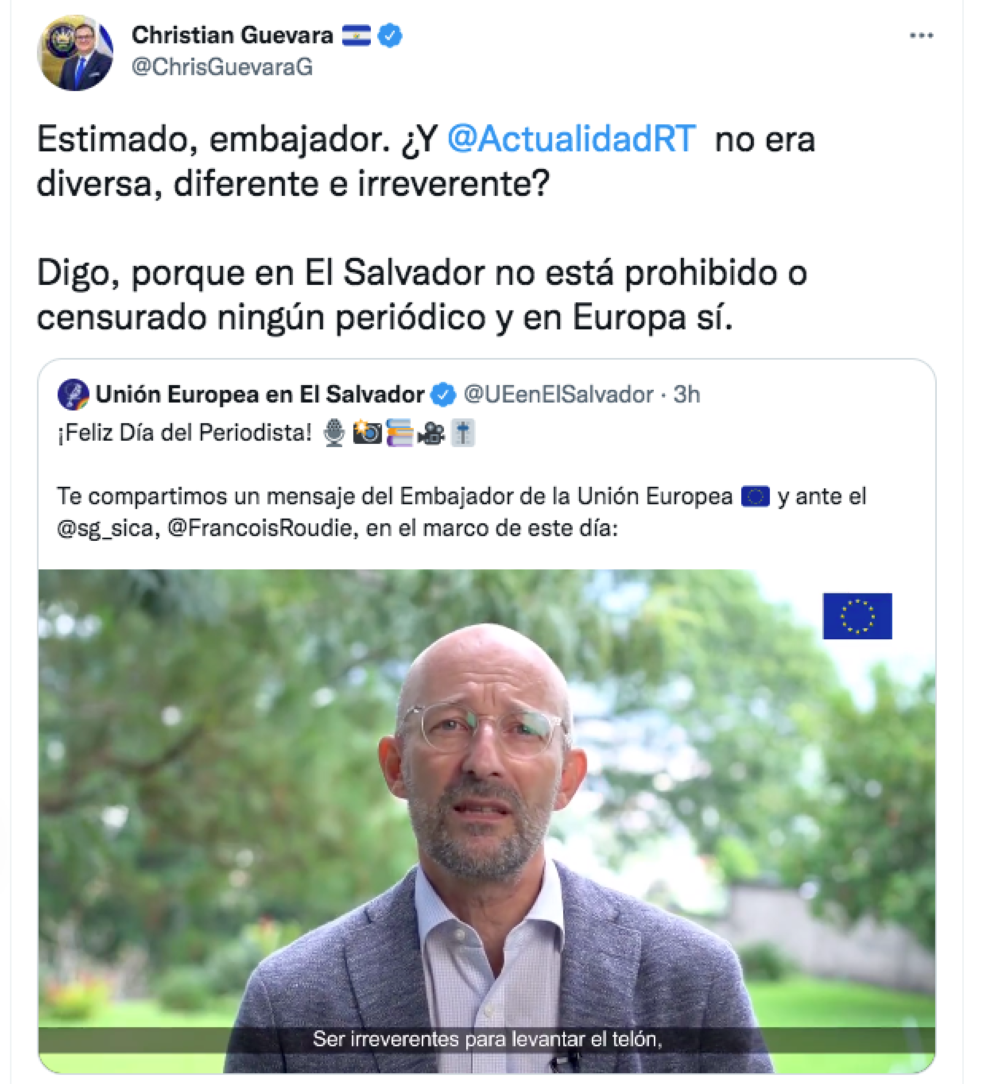 “Estimado, embajador. ¿Y ActualidadRT no era diversa, diferente e irreverente? Digo, porque en El Salvador no está prohibido o censurado ningún periódico y en Europa sí”, publicó Christian Guevara.
