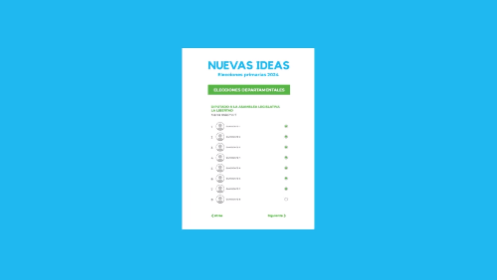 Si el afiliado tiene su DUI y su código, deberá ingresar al sitio web de Nuevas Ideas y darle cliquear en la opción "Vota aquí".La Ley de Partidos Políticos exige a todos los partidos políticos que seleccionen a sus candidatos a través de voto libre, directo, igualitario y secreto de sus miembros o afiliados inscritos en un padrón correspondiente a su circunscripción territorial.
