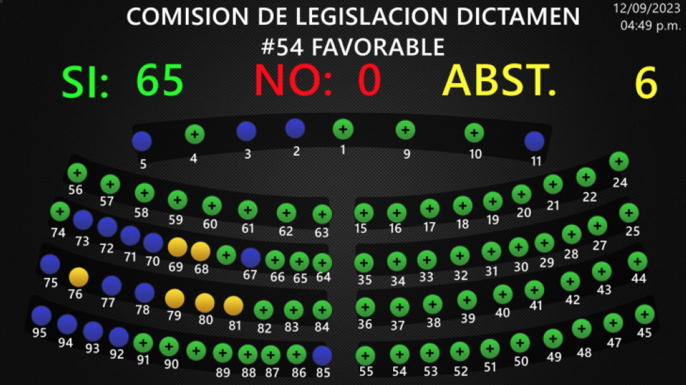 El dictamen de la Comisión de Legislación fue aprobado en el pleno con 65 votos de Nuevas Ideas, Gana, PDC y diputados que renunciaron de Arena; seis diputados se abstuvieron de Arena, Nuestro Tiempo y Vamos. Ambos decretos se aprobaron con 66 votos.