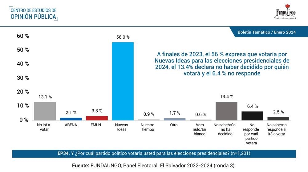 Los resultados de la intención de voto para las elecciones presidenciales de 2024 que presentó el Centro de Estudios de Opinión Pública (CEOP) de Fundaungo refleja que el 84.4 % de personas sí acudiría a votar y de ellas 56 % expresa que votaría por Nuevas Ideas.