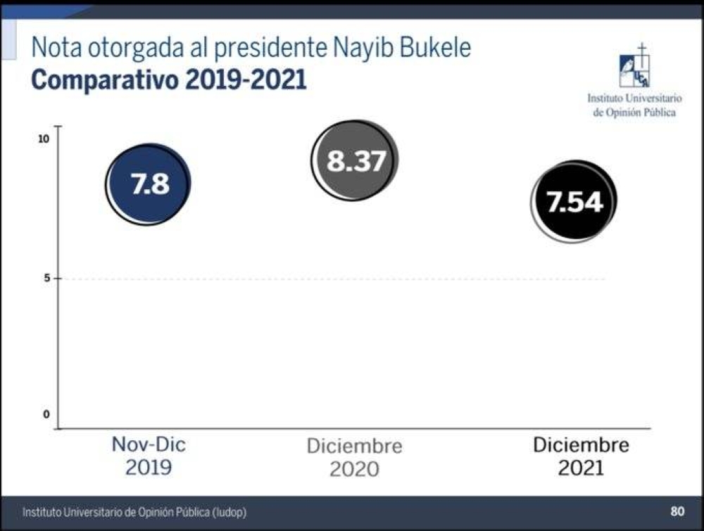 En la encuesta realizada del 13 al 20 de agosto de 2021, los salvadoreños le habían dado una nota de 7.64, la más baja lograda hasta ese momento. Pero en los estudios anteriores el mandatario salvadoreño había logrado notas de 8.51 en mayo de 2021, 8.37 en diciembre de 2020 y 7.8 en noviembre-diciembre de 2019.
