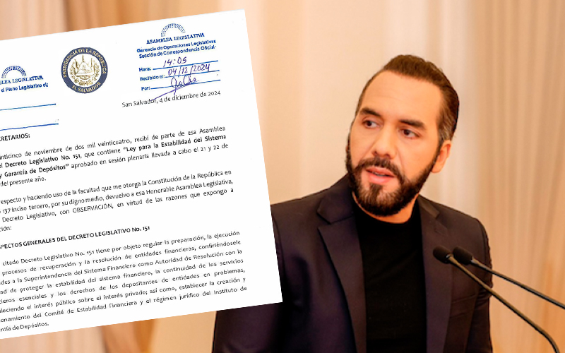 El presidente salvadoreño, Nayib Bukele, devolvió a la Asamblea Legislativa con observaciones la Ley de Estabilidad Financiera y Garantía de Depósitos, las cuales fueron aprobadas con dispensa de trámites con los votos de 57 diputados de Nuevas Ideas y sus aliados.