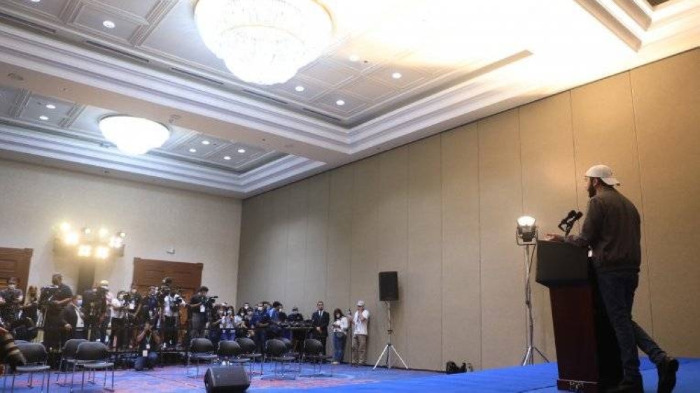 Nayib Bukele en una conferencia de prensa el 28 de febrero de 2021 en medio del proceso electoral para alcaldes y diputados. / Presidencia.