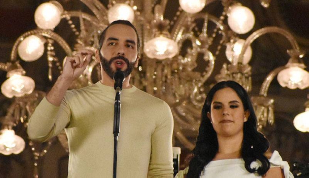 El presidente reelecto, Nayib Bukele, apareció anoche bajo el arco de la gran ventana principal del Palacio Nacional, al centro de la fachada. Desde arriba, le habló a sus fanáticos, seguidores y simpatizantes que gritaban consignas.