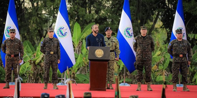 Desde marzo de 2022, la Asamblea Legislativa aprobó un régimen de excepción que suspendió tres derechos constitucionales bajo el cual el gobierno registra 90,600 supuestos pandilleros capturados. Mientras organizaciones no gubernamentales denuncian que bajo esta medida han muerto más de 400 personas en las cárceles bajo custodia estatal y han registrado 6,500 denuncias de supuestas violaciones a derechos humanos, el gobierno dice que ha habido 1,093 días sin homicidios durante la gestión Bukele.