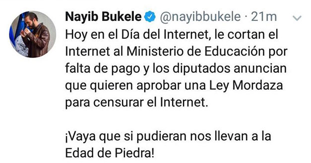 El presidente electo, Na­yib Bukele, criticó la petición, señalando que se trata de una ley mordaza. “Es extraño que autodenominados Defensores de la Libertad de Expresión y Prensa no se pronuncien en contra de la Ley Mordaza”, escribió. Retuiteó: “¿Dónde meterán a esos 1.4 millones de troles. Amnistía para los asesinos de guerra, pero prisión de hasta ocho años para el humor”.