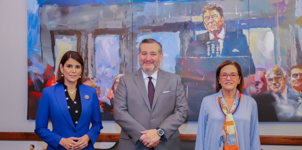 La embajadora Milena Mayorga, el senador republicano Ted Cruz y la canciller Alexandra Hill. / @cancilleriasv.