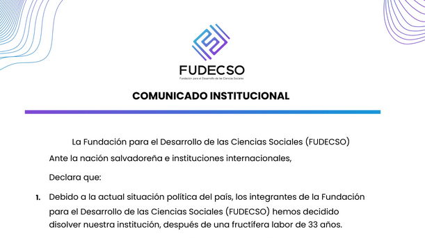 “Tras 33 años de labor en favor de la democracia, las ciencias sociales y la ciudadanía en El Salvador, Fudecso anuncia su disolución ante el cierre del espacio cívico y la aprobación de la Ley de Agentes Extranjeros”, escribió Fudecso en X.