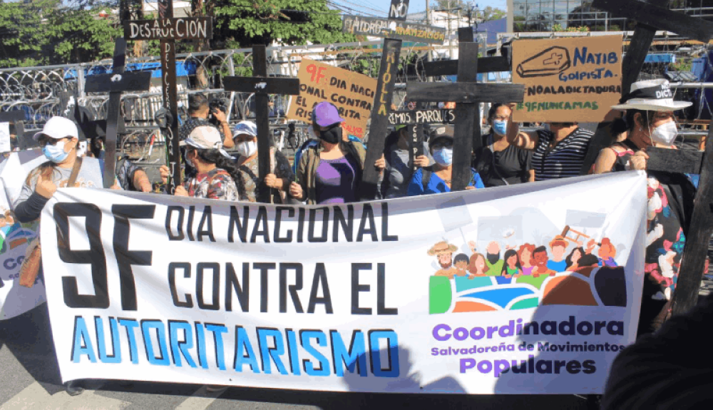 La Coordinadora Salvadoreña de Movimientos Populares también declaró simbólicamente el 9 de febrero como “Día nacional de la lucha contra el autoritarismo”, mensaje que plasmaron en pancartas y consignas de protesta.Hoy se cumplen dos años del asalto militar del presidente Nayib Bukele a la sede de la Asamblea Legislativa, que constituyó un golpe contra la separación de poderes, la institucionalidad, el Estado de Derecho y la incipiente democracia del país".