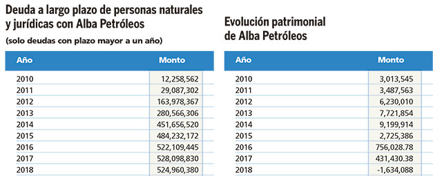 La deuda contiene 357 veces la utilidad más alta que la sociedad mixta tuvo en un año y 154 veces sus utilidades de cinco años. Solo deuda a largo plazo de los beneficiados con créditos de Alba Petróleos subió 4,182 % de 2010 a 2018.